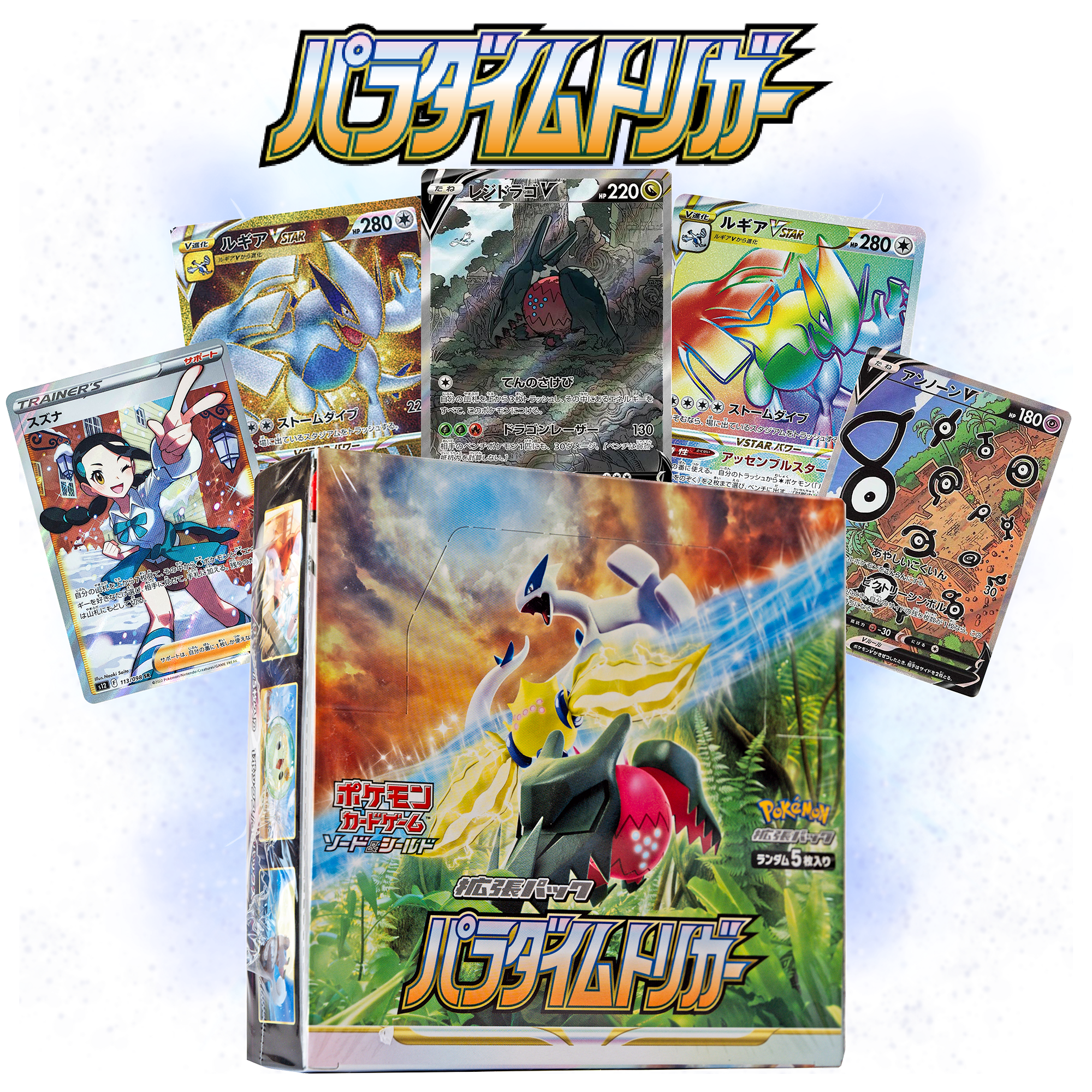 The Paradigm Trigger Booster Box is a Japanese Pokémon Trading Card Game (TCG) set featuring a variety of collectible and playable cards. This set includes Lugia VSTAR, Regidrago VSTAR, and Trainer Gallery cards, along with possible rare and secret cards. It is ideal for collectors and players looking to expand their card collection.